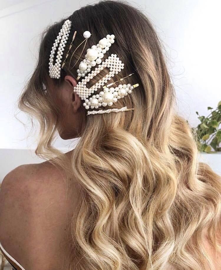 Круто выглядят огромные заколки с жемчужинами, которые не фиксируют, а только декорируют причёску, жемчужные нити, вплетённые в косу или распределённые по всей причёске, разумеется, классические заколки. Причём заколки сочетают между собой.